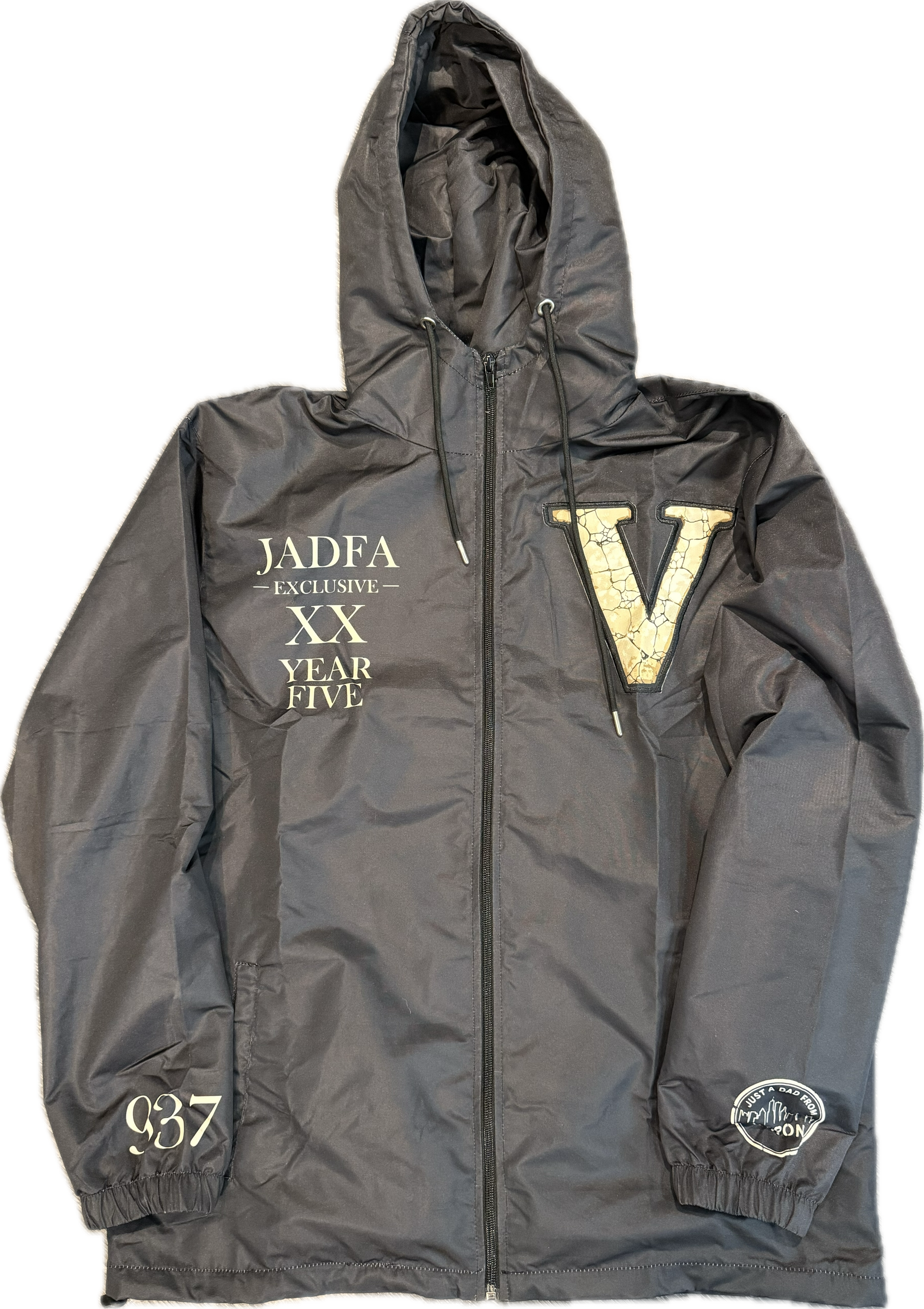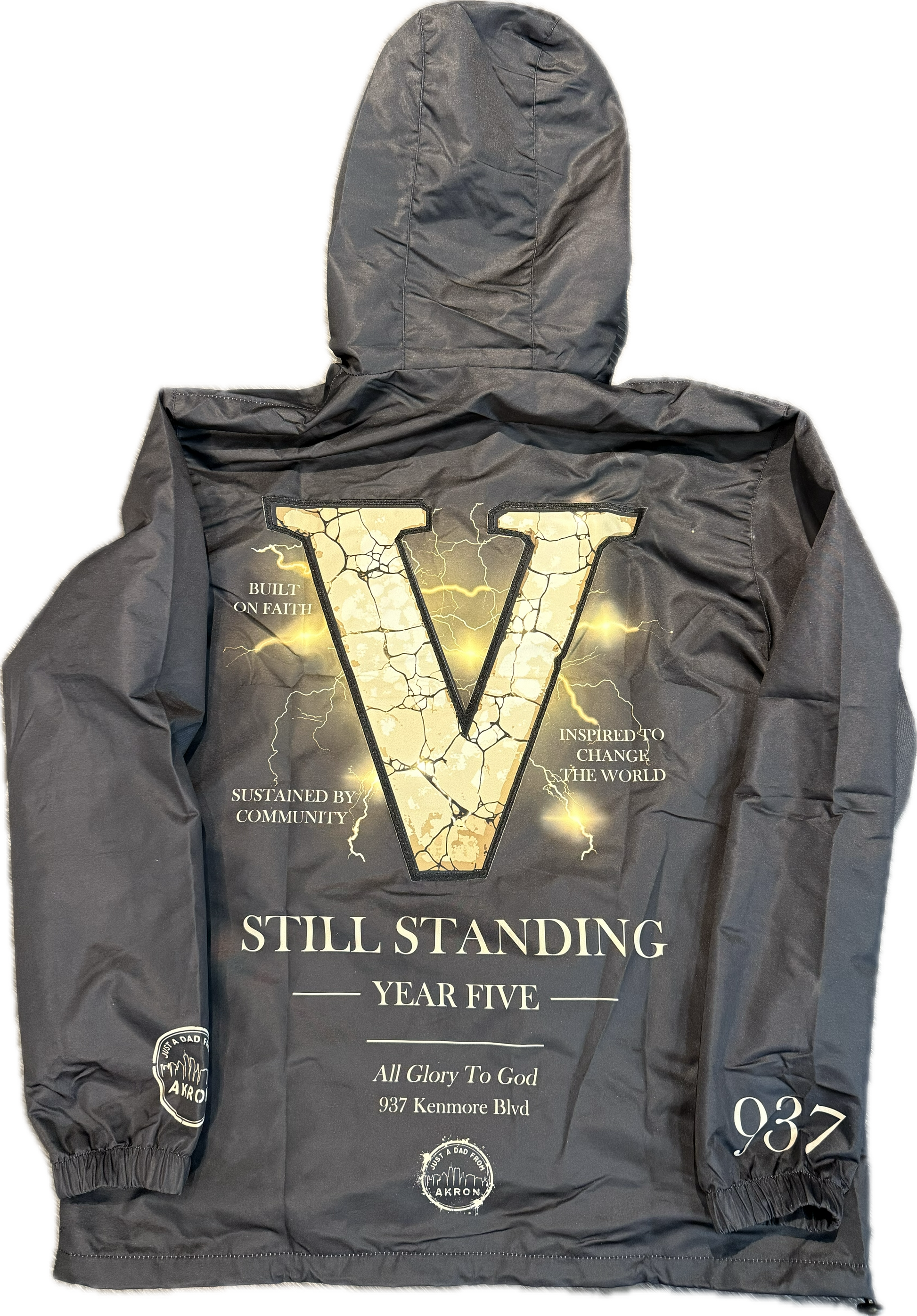 The Still Standing Jacket represents the journey behind Just A Dad From Akron. The cracked V symbolizes pressure and trials — reminders that even when life tries to break us, faith keeps us standing.